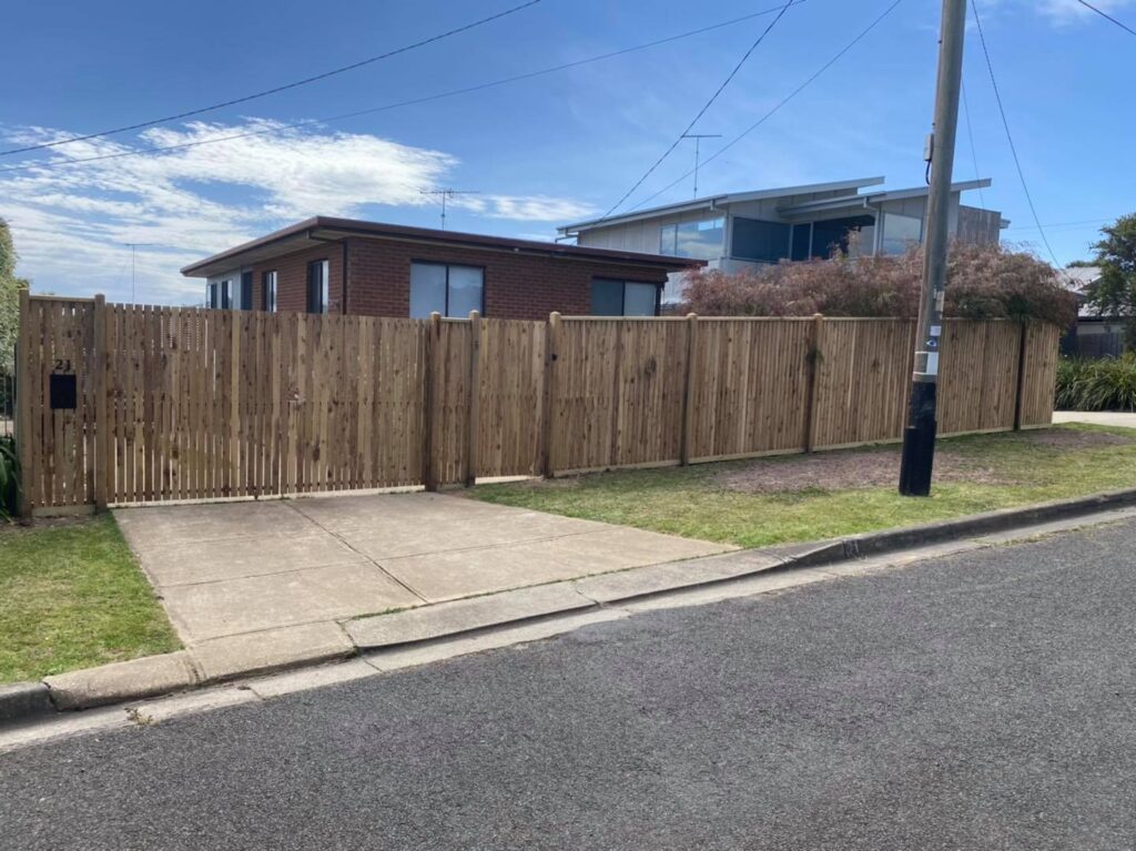 How good does this Dressed Cyprues pickets on a half plinth and treated pine capping. Double Gates and a Single access gate with a key lock..